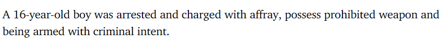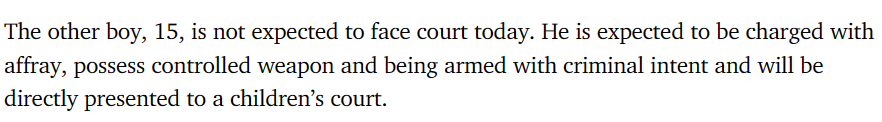 另一名男孩只有15岁,预计他将被指控聚众斗殴、持有管制武器和持有犯罪意图武装罪名,并将直接被送往儿童法庭。