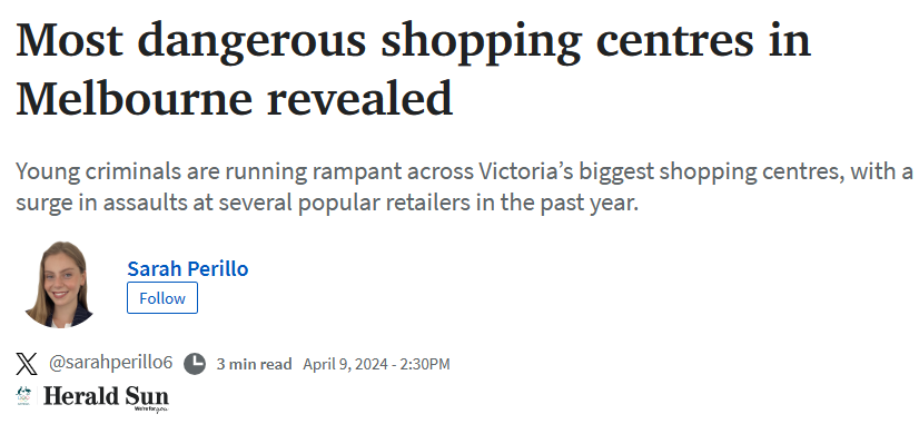 Wantirna South地区的购物中心去年记录了84起犯罪,比2022年的59起增加了接近一半。今年8月,一名17岁男孩据称Westfield Knox外遭到一名14岁少年持砍刀袭击,背部受伤,这起事件还是在白天发生的...Maribyrnong地区犯罪事件数量激增,该地区包括购物中心Highpoint,从2022年的56起激增至2023年的137起,增长了一倍以上!另外,尽管墨尔本北区和西区的零售商未上榜,但这些地区青少年刀具犯罪已变得频繁。就比如今年1月,在西区的Woodgrove购物中心,三名青少年因一起恐怖事件被逮捕,其中一名青少年据称用砍刀砍向一名十几岁的男孩。