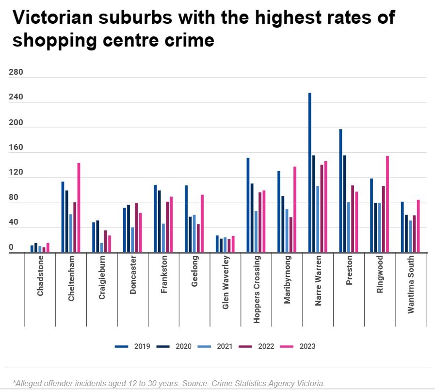 Ringwood购物中心的犯罪率居于榜首,包括Eastland。2023年,该年龄组犯下154起犯罪,这包括了33起针对个人的犯罪,包括攻击、性犯罪、绑架、跟踪、骚扰和威胁行为。此外,还记录了105起盗窃、纵火和财产损坏犯罪。与2022年的106起犯罪相比,这一数字激增了接近一半!Narre Warren购物中心的犯罪率位列第二,该地区记录了146起犯罪。其中包括58起针对个人的犯罪以及74起盗窃、财产和欺诈犯罪。Cheltenham地区排名第三,该地区的Westfield Southland及其他商店去年共发生了143起犯罪,比前一年增加了78%!在过去五年中,Cheltenham记录了最多的针对个人的犯罪,达到了39起。此外,还记录了86起盗窃、财产和欺诈犯罪。除了这三个地区,墨尔本Doncaster在去年记录了63起犯罪,Glen Waverley记录了26起。