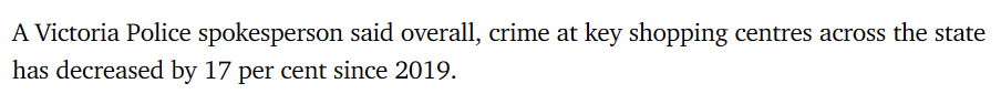 维州警方发言人表示,自2019年以来,全州主要购物中心的犯罪案件数量总体减少了17%。