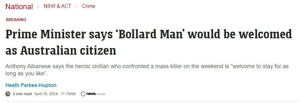 另外,澳洲国家大力嘉奖平民英雄,昨天澳洲总理公开表示,将对Bondi Junction袭击案中表现英勇的“路障侠”奖励,方式也很实惠,那就是送上澳洲国籍,想在澳洲住多久都行...
