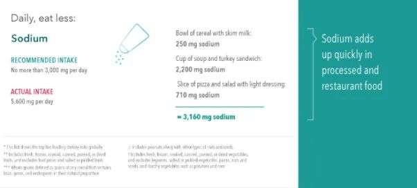 不良饮食对健康危害极大,那我们应该怎么调理搭配日常饮食呢?这份GBD的报告给了一些建议,比如每天不超过3g的钠摄入量。对照食物中的含钠量多少来选择食物。