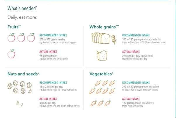 此外,全世界的人每天只吃了推荐量的12%的坚果和种子,却喝了推荐量的10倍的含糖饮料。