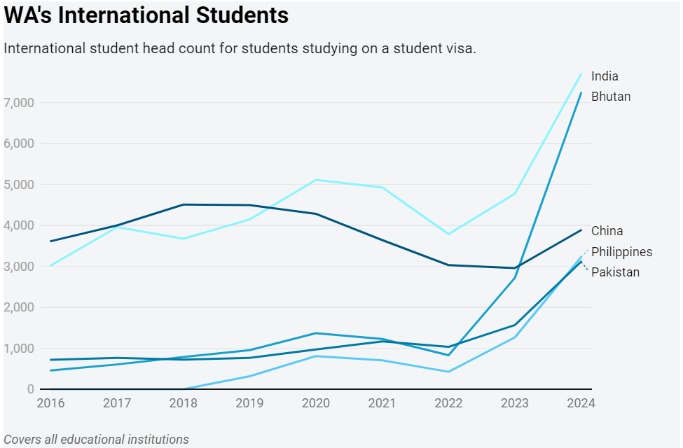 十年前,不丹甚至不在西澳留学生来源国前 20 名之列,但从 2015 年开始,这一数字开始攀升,截至 2024 年,全州有 7,238 名持学生签证的不丹学生入学。