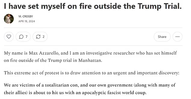 据报道,自焚男子名叫马克斯·阿扎雷洛(Max Azzarello),是一个精神极不稳定的阴谋论者。