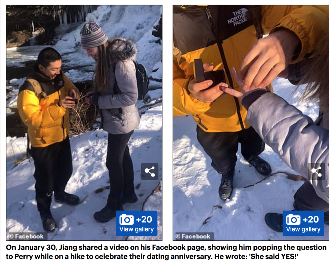 2021年1月30日,美国米德尔敦沃兹沃思州立公园,耶鲁大学环境科学专业大二研究生蒋凯文(Kevin Jiang)单膝跪地,向自己的女友佩里(Zion Perry)许下一生的诺言。在公园的瀑布旁,刚刚考上耶鲁大学研究生的佩里沉浸在喜悦中答应了求婚,而这甜蜜的一刻被同行的友人记录下来。