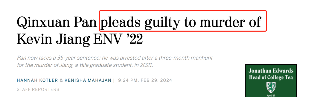 当潘勤轩认罪的那一刻,耶鲁大学日报《耶鲁每日新闻》火速刊发了消息,刻意用“承认谋杀”的字眼,让一度牵挂着蒋凯文的人们释然了很多,同时也让耗时3年的凶案得以画上句号。蒋凯文去世后,耶鲁大学一些学生在海狸池塘公园种了一棵树,用来纪念善良美好的他。