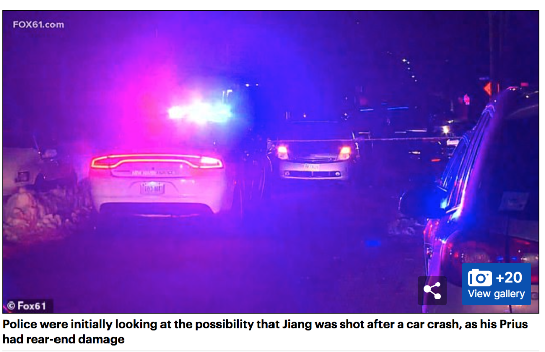从佩里住处出来后,蒋凯文按照往常一样开车回家,脑海中还在回味着和未婚妻的甜蜜,只听砰的一声,在纽黑文东岩的纳什街(Nash St.)和劳伦斯街(Lawrence Street)的交叉口,一辆深蓝色丰田SUV汽车毫无征兆地直接追尾撞了上来。奇怪,这个时间点明明很少车, 于是他下车查看。还没等蒋凯文靠近说上两句,只见车里一个亚裔的男子快速下车后直接掏出了手枪,对着毫无防备的蒋凯文直接射击,近距离连续开枪7下,随后逃离现场。