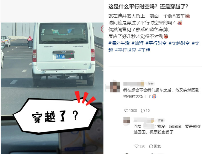 一名在某社交平台上曾分享自己在迪拜的大街上看到了一个浙A的车,博主怀疑自己遇见了什么平行时空,还很真诚的发问:
