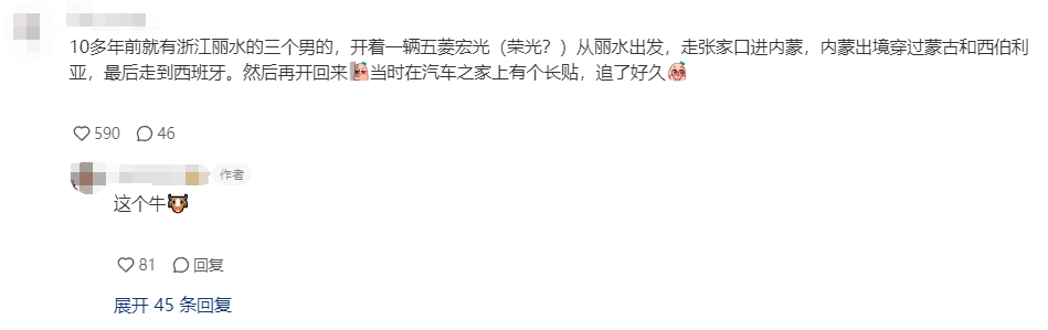 “10多年前就有浙江丽水的三个男的,开着一辆(貌似是)五菱宏光从丽水出发”,走张家口进内蒙,内蒙出境穿过蒙古和西伯利亚,最后走到西班牙,然后再开回来。”