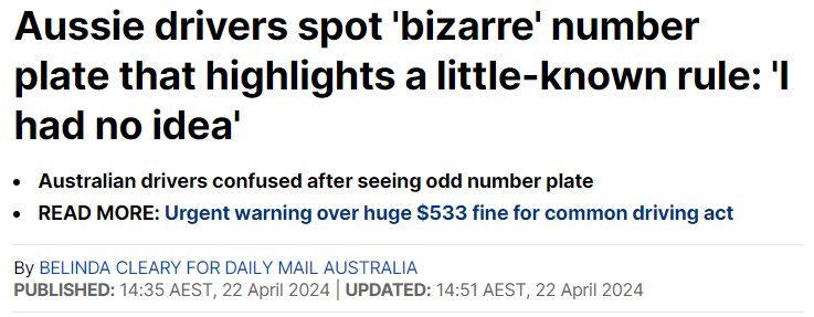 据《每日邮报》4月22日报道,一辆在澳洲路上行驶的汽车,由于其“奇怪”的车牌,让司机们感到困惑。