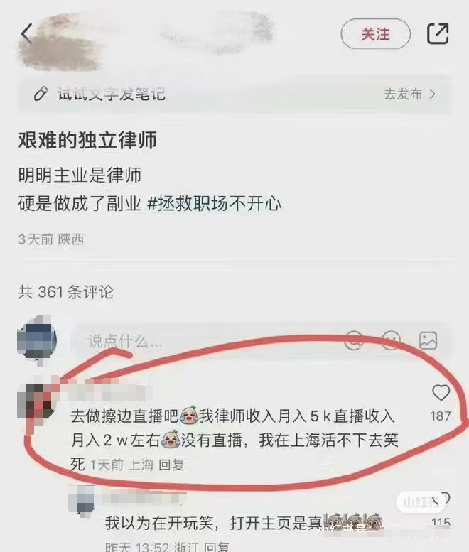 近日,一名自称青年律师的网友在律师相关讨论帖中评论“去做擦边直播吧”,称自己律师收入月入5000元,直播收入2万元左右,“没有直播,我在上海活不下去”引发热议。
