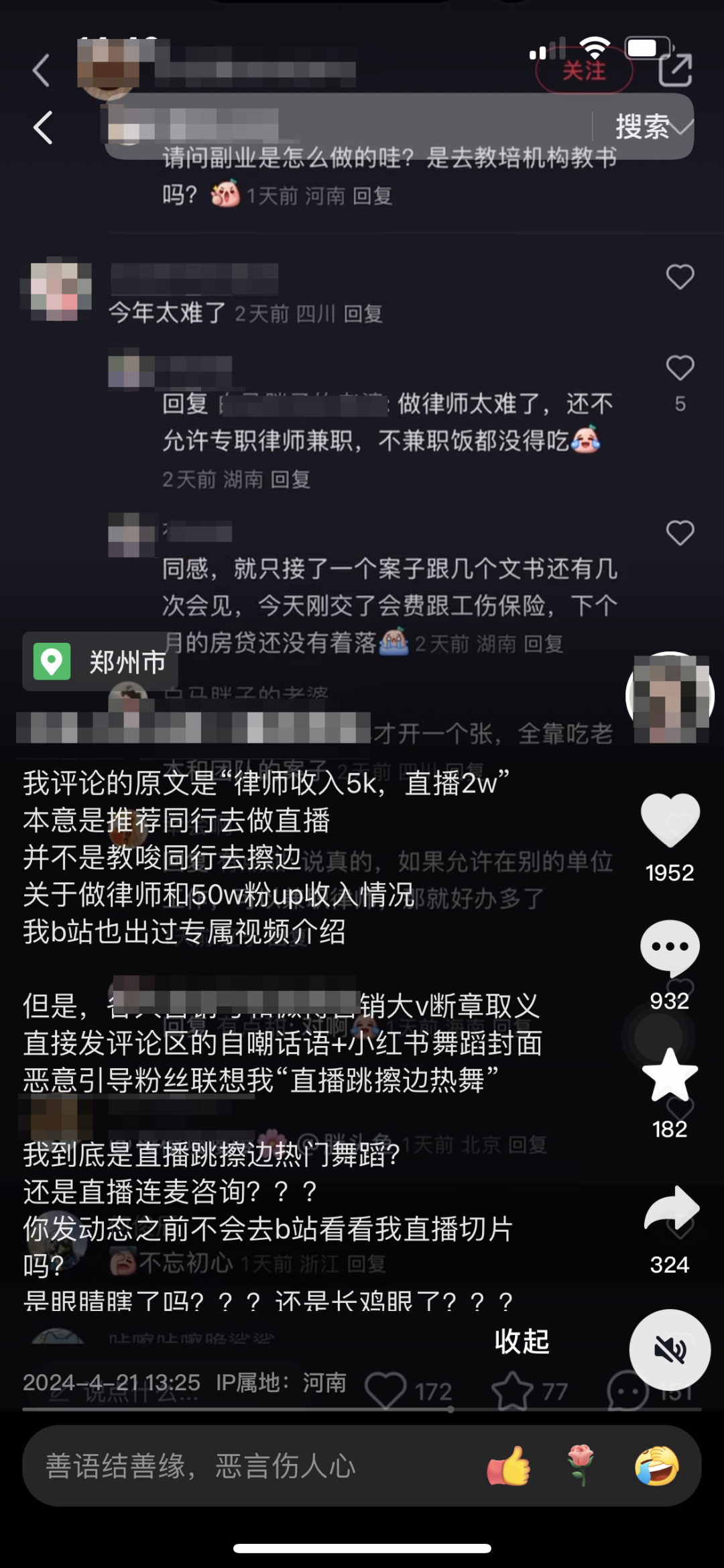 据报道,近日,网传“上海一律师因月入5千无法生存,做擦边直播月入2万”的帖子引发热议。随后,该博主发视频回应称,这只是自己当时的玩笑话,但被很多人转载造谣自己是38岁已婚女律师做擦边直播,希望各大营销号停止转载造谣,并为自己的言论道歉。而查看该博主发布的视频,确实存在舞蹈和普法相结合的视频。