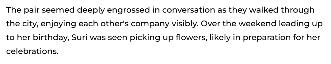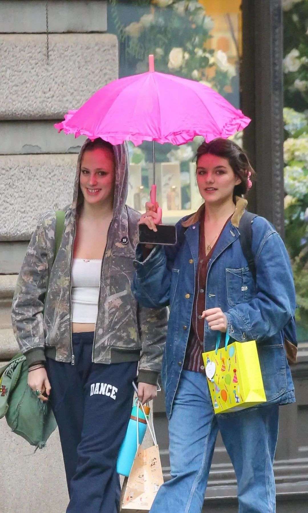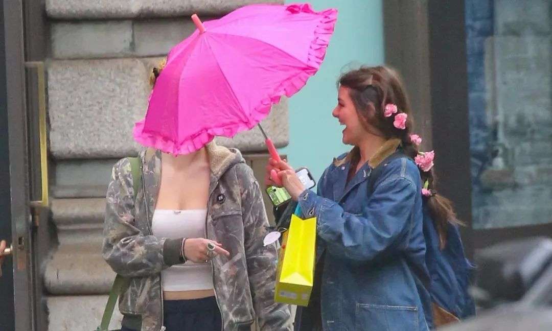 当天纽约下着点小雨,Suri就撑着一把亮粉色的宫廷风小伞,给自己和小伙伴遮挡。俩人走在路上一边乐一边聊,Suri手上还挂着一个像是生日礼物的袋子,看起来心情倍儿棒。