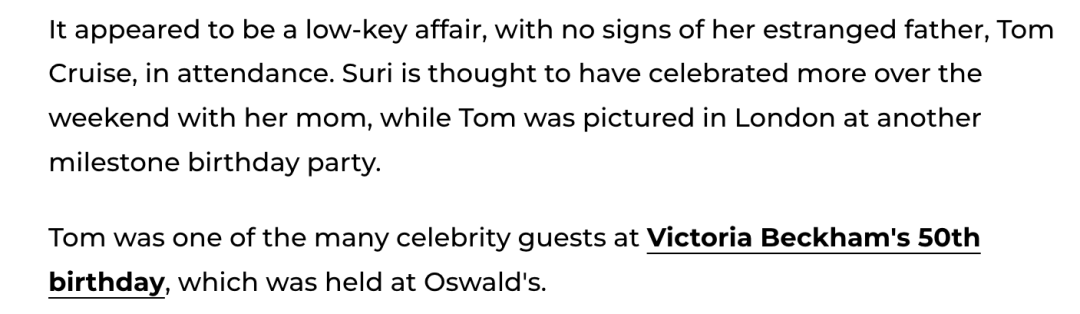 阿汤哥则被拍到在伦敦参加贝嫂—维多利亚·贝克汉姆 50 岁生日聚会。当晚发布的多张照片中,阿汤哥笑容满面,穿着燕尾服,看上去很帅气。