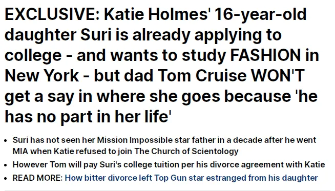 根据当年的离婚文件报道,他向凯蒂支付的每年40万美元抚养费,也将在苏瑞18岁这年停止。