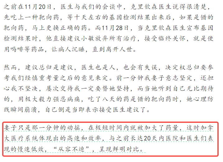 “作为医生,我只能遗憾地说一句:尊夫人是不幸的,遇到了加拿大的医疗制度和医生,更是雪上加霜啊!节哀顺变!”
