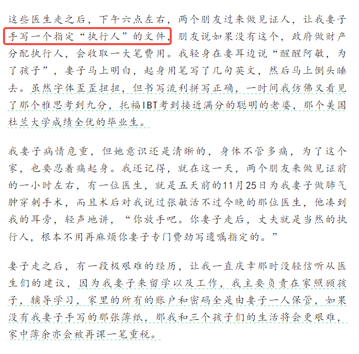 文中提到,在妻子于安宁病房内临终的前一天,“两个朋友过来做见证人,让我妻子手写一个指定‘执行人'的文件,朋友说如果没有这个,政府做财产分配执行人,会收取一大笔费用。我轻身在妻耳边说'醒醒阿敏,为了孩子',妻子马上明白,起身用笔写了几句英文,然后马上倒头睡去。”