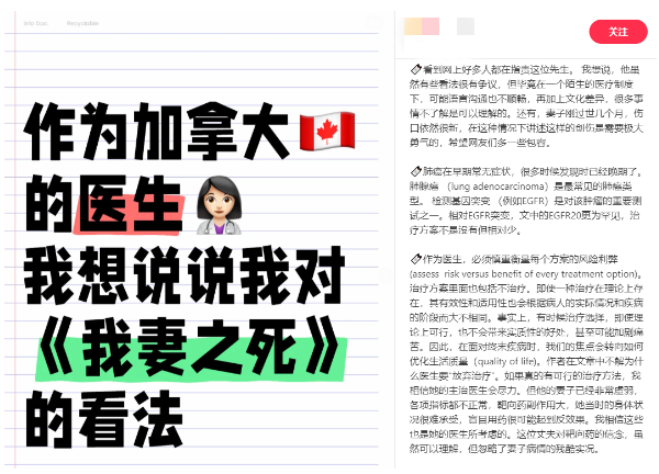 文章的作者在这篇长文中,详细记录了37岁的妻子在加拿大从身体感到不适、寻医问诊、确诊治疗拖延再到被建议"临终关怀"离世不到两个月的痛苦过程,瞬间引爆网络。许多网友由此对加拿大医疗制度展开了讨论。