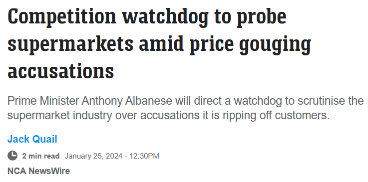 对此,不久前澳洲政府官宣,由于超市被指哄抬物价,将指示澳洲竞争与消费者委员会(ACCC)对超市行业进行审查!
