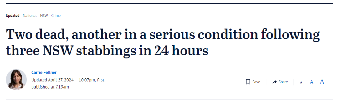悉尼一天时间内就有3起持刀伤人案,还导致了2死1重伤的惨烈后果。