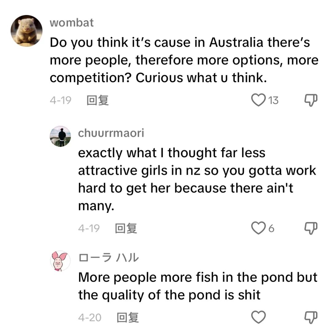 大家觉得之所以澳洲会出现这样的情况,是因为“澳洲人多,大家选择多”,在新西兰“好女孩不多,所以大家遇到了优秀的需要更努力追求”。