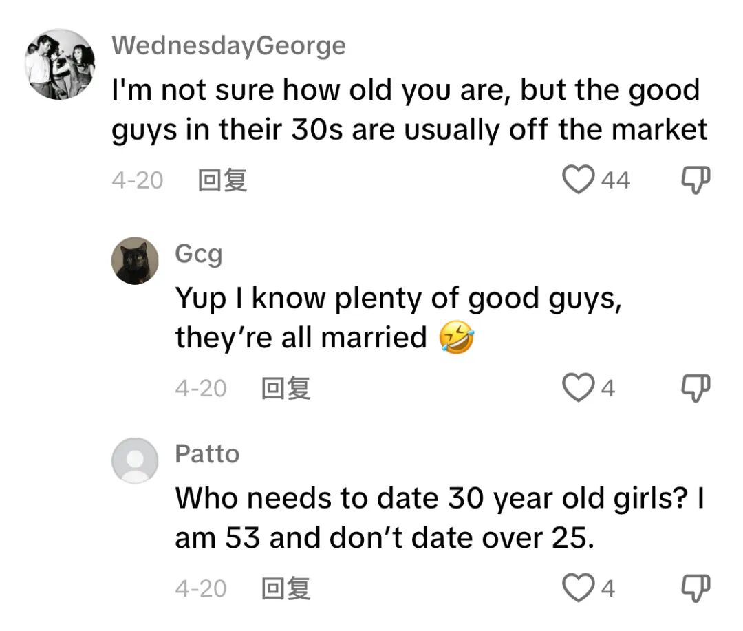 澳洲那边也发话了,有人说“30多岁的男生都不在婚恋市场上流通了,他们大都已经结婚”,甚至还有人说“谁愿意和30多岁的女生约会?我53了只约25岁以下的”。