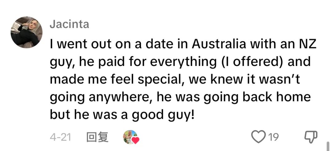 “我在澳洲和新西兰男生约会过,他买单并让我觉得自己很特别,即使我们不知道我们能不能成,但是他真的是个好男人!”