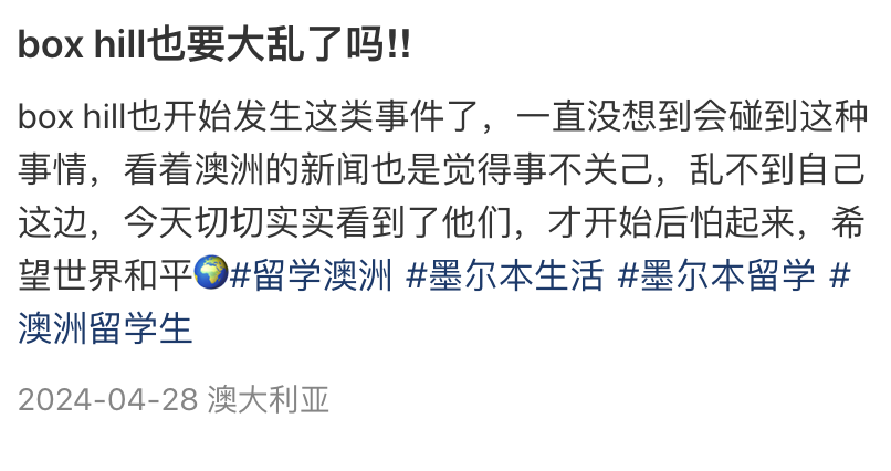 box hill也开始发生这类事件了,一直没想到会碰到这种事情,看着澳洲的新闻也是觉得事不关己,乱不到自己这边,今天切切实实看到了他们,才开始后怕起来,希望世界和平。