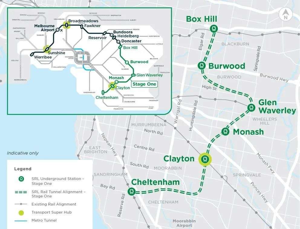 SPR一期工程也叫“SRL East”,就是位于墨尔本东区的一段,贯穿Cheltenham、Clayton、Monash、Glen Waverley、Burwood和Box Hill。