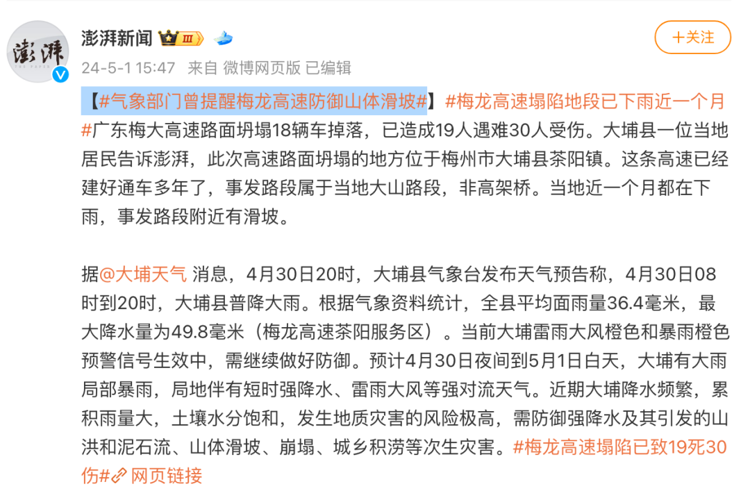 据澎湃新闻5月1日稍早前报道,对于此次高速路面坍塌事故,广东大潮高速公路有限公司官方微信公众号5月1日7时许发布消息称,“受连续强降雨影响,5月1日凌晨2点零9分接报,S12梅龙高速(梅大段)往福建方向K11+900处发生自然地质灾害,导致路面塌陷……”