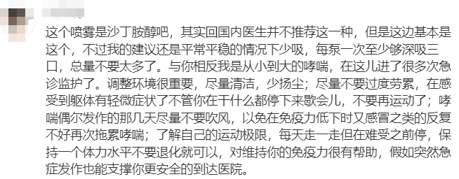 一位自己患有哮喘多年的华人建议说,“平时平稳的情况下可以少吸这个药,总量不要太多...我是从小到大的哮喘,在这边进了很多次急诊监护了,调整环境很重要,尽量清洁、少扬尘;