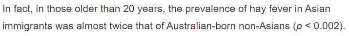 有约60%的亚裔移民,会在移民澳洲后的三年之内,患上哮喘或花粉热。