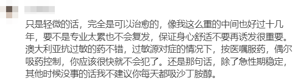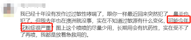 “随身携带喷雾,花粉季吃抗过敏的药,我以前都没啥过敏的东西,来澳洲后时间长了也得了轻度哮喘,现在也有点鼻炎...”