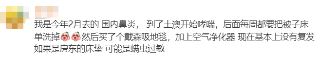 “我就是鼻炎,然后2月到澳洲开始哮喘,后面每周都要把被子床单洗掉,然后买了个戴森吸地毯,加上空气净化器,现在基本上没有复发,如果是房东的床垫,可能是螨虫过敏...”