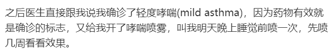 之后医生直接跟我说我确诊了轻度哮喘(mild asthma),因为药物有效就是确诊的标志,又给我开了哮喘喷雾,叫我明天晚上睡觉前喷一次,先喷几周看看效果。
