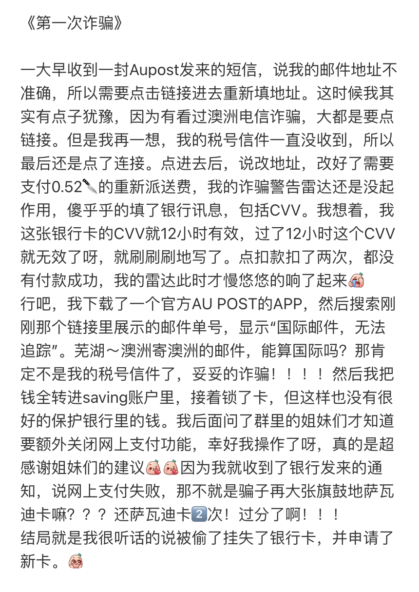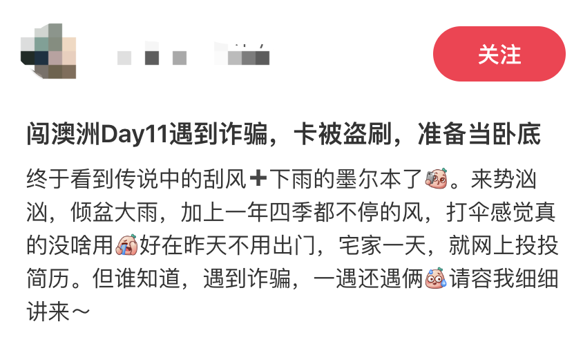 在社交媒体“小红书”上,很多华人同胞分享了自己在澳洲被盗刷银行卡的经历,骗局五花八门,骗子手段多种多样。