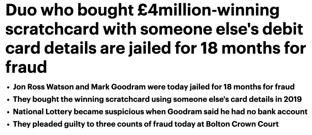 中奖后,两人在社交媒体上大肆炫耀,最后被发现,付款的银行卡已被挂失。