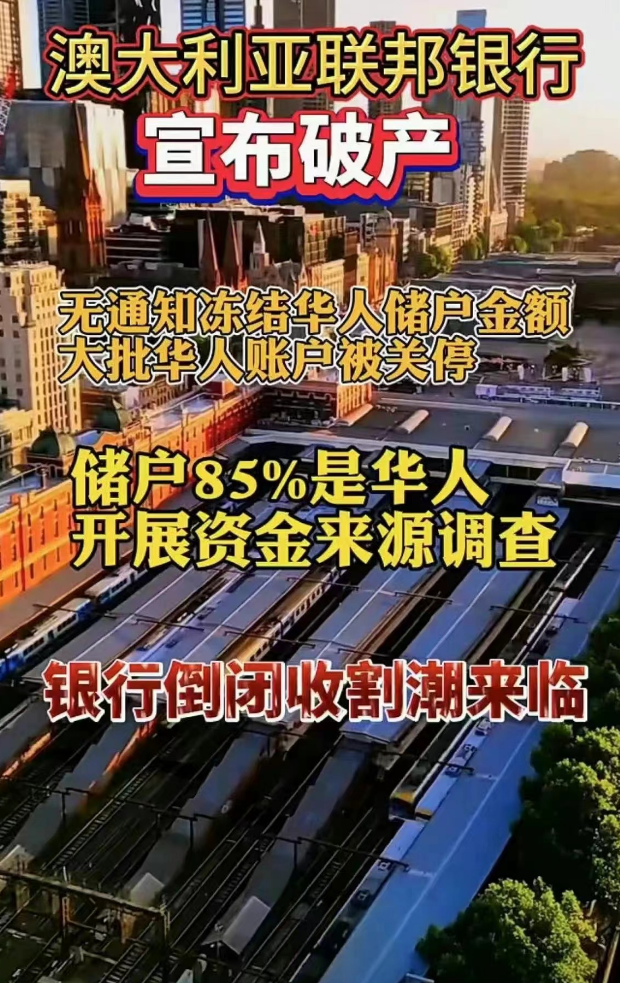 一张澳洲火车站的配图,上面直接写着澳大利亚联邦银行破产,无数华人账户被关停。