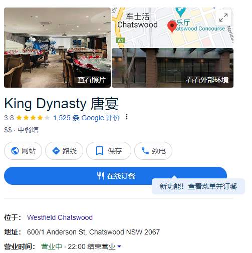 卷入纠纷的中国餐厅位于悉尼 Chatswood ,名叫“King Dynasty 海鲜餐厅”,中文名也叫“唐宴”。