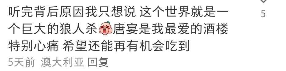 “听完背后原因我只想说 这个世界就是一个巨大的狼人杀。唐宴是我最爱的酒楼,特别心痛,希望还能再有机会吃到。”