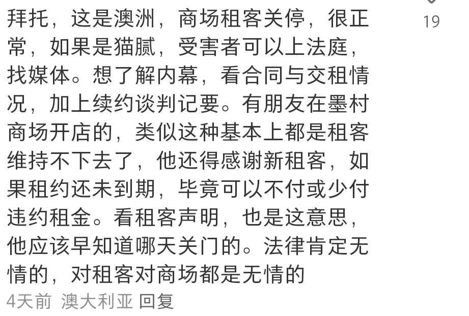 “拜托,这是澳洲,商场租客关停,很正常,如果是猫腻,受害者可以上法庭,找媒体。想了解内幕,看合同与交租情况,加上续约谈判记要。有朋友在墨村商场开店的,类似这种基本上都是租客维持不下去了,他还得感谢新租客,如果租约还未到期,毕竟可以不付或少付违约租金。看租客声明,也是这意思,他应该早知道哪天关门的。法律肯定无情的,对租客对商场都是无情的。”