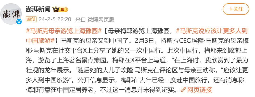 说起来,马斯克刚刚结束访华,还公开表示自己是中国的超级粉丝,他从中国带一份母亲节的礼物似乎真的很正常。