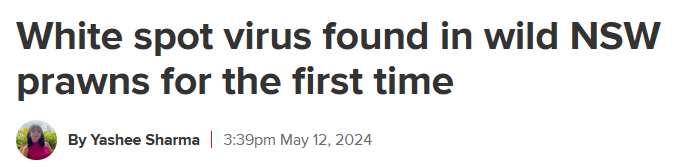 随后,当局在该地区建立了一个控制区,限制了部分虾类的运输,预计将至少持续三个月。Evans Head以南的Clarence River附近已经有一个单独的白斑综合症病毒控制区。