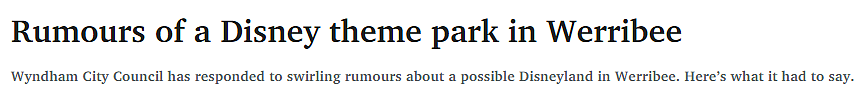 本周有传言称,Werribee可能会成为未来迪士尼新主题公园的所在地,此前,去年曾有猜测称这家娱乐巨头正在澳洲物色潜在的主题公园选址。