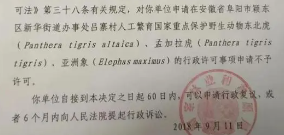 对你单位人工繁育东北虎、孟加拉虎和亚洲象的申请不予许可。