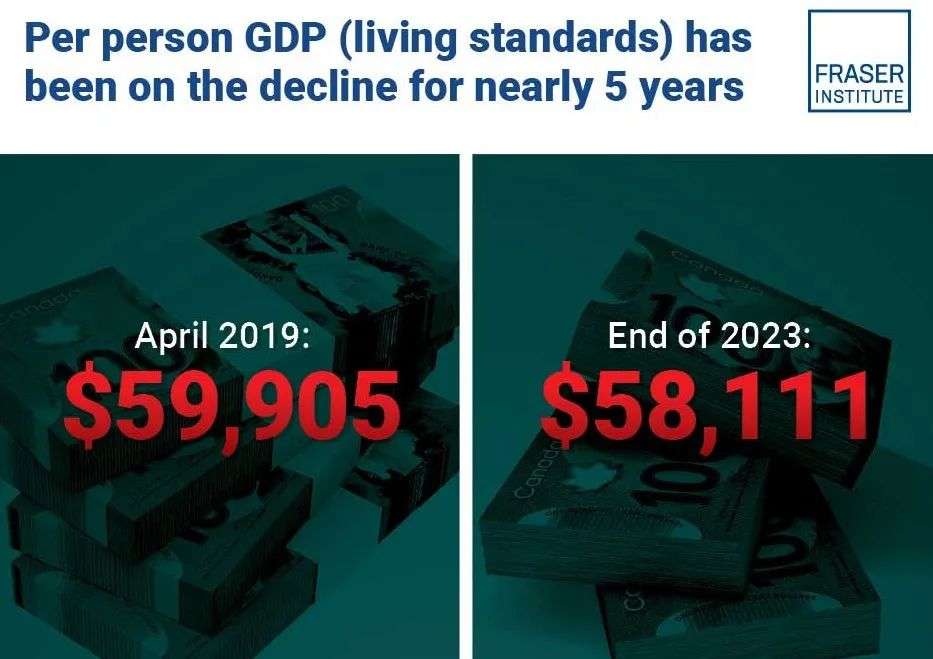 报告称,作为衡量生活水平的广泛指标,加拿大经通胀调整后的人均GDP从2019年4月到2023年底,从每年59,905元降至58,111元,降幅为3%,是近40年来第三大降幅。