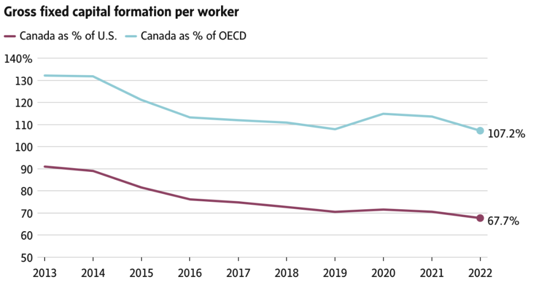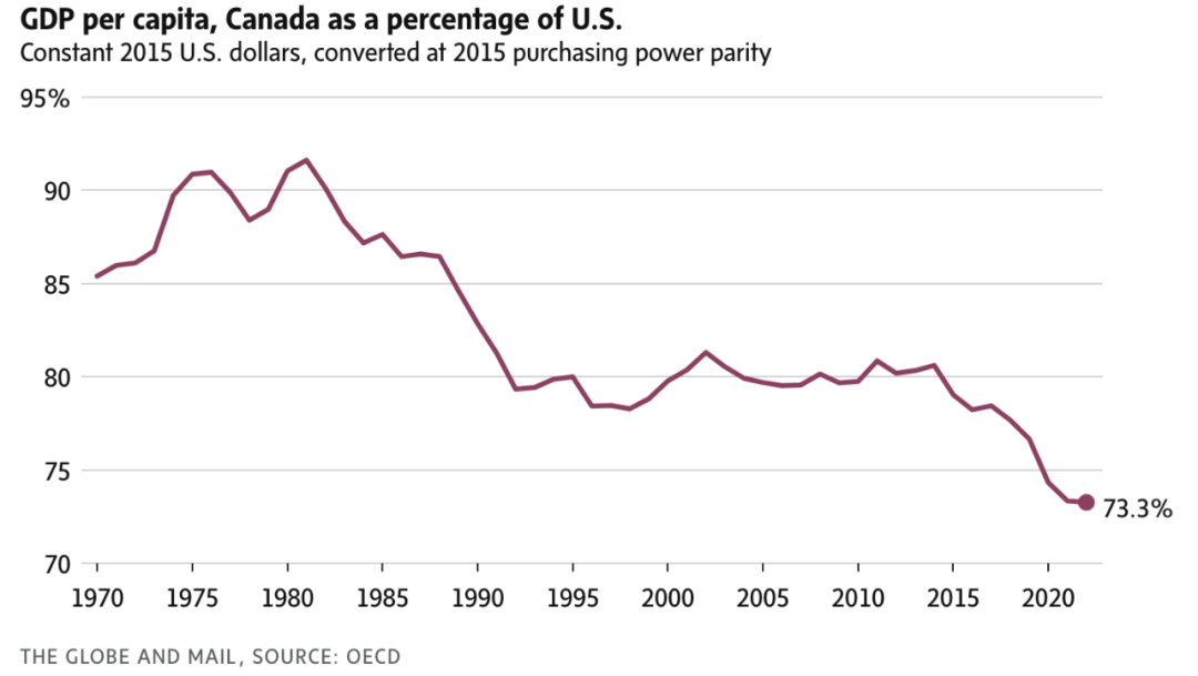 与我们最近的邻国相比,情况尤其令人不安。截至1981年,加拿大的人均GDP为美国的92%;到2022年,这一比例下降到了73%。