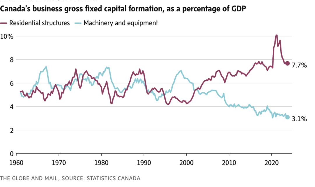 加拿大生产力的衰退有很多原因,也有很多补救措施。其一是我们的投资率低下,统计界称之为“固定资本形成总额”。我们生产率令人担忧的恶化与加拿大企业投资的异常相对下降密切相关。