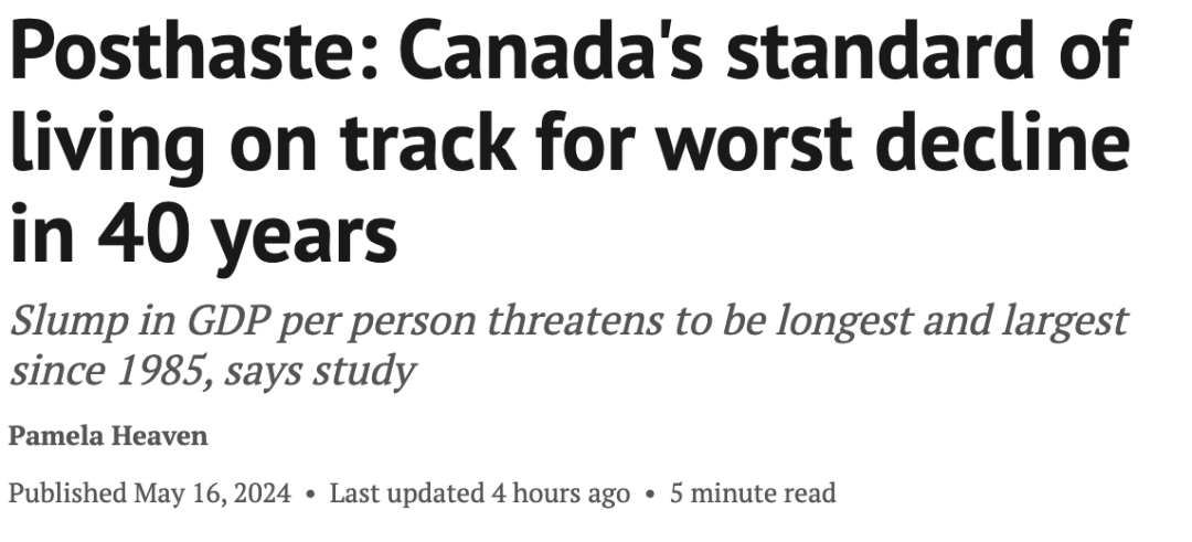 文章写道,加拿大现在的经济增长速度低于人口增长速度,这就是人均GDP正在下降的原因;就生活水平而言,真正重要的是人均GDP。
